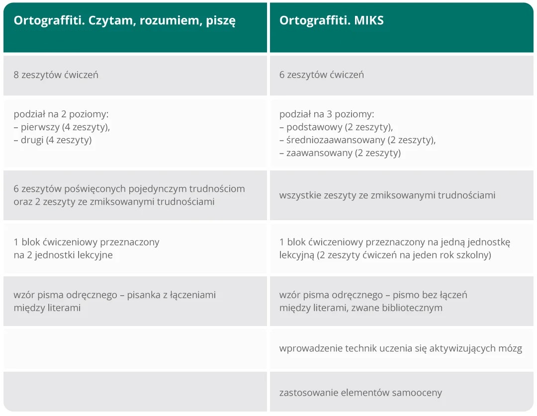 NOWA WERSJA serii Ortograffiti. Czytam, rozumiem, piszę różni się od obecnej głównie tym, że cały materiał ortograficzny jest wdrażany naprzemiennie i wielokrotnie. Oznacza to, że jedna trudność ortograficzna jest ćwiczona w pojedynczych blokach (a nie całych zeszytach, jak dotąd) i powtarzana w wielu zeszytach: JEDEN ZESZYT – MIKS TRUDNOŚCI. Jest to odpowiedź na zmieniającą się wrażliwość percepcyjną uczniów, która domaga się materiałów o dużej różnorodności i zmienności. W sprzedaży dostępne będą obie wersje (obecna i nowa), dlatego w poniższej tabeli przedstawiono ich porównanie. Dzięki temu nauczyciel będzie mógł dokonać odpowiedniego wyboru.
